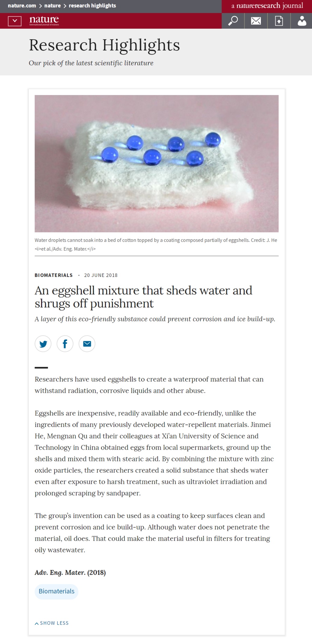世界著名科学刊物《自然》Research Highlights栏目近日报道了公司在超浸润材料领域的一项研究进展,将其作为该领域的一个研究亮点,以An eggshell mixture that sheds water and shrugs off punishment为题目,进行了专文介绍和评述。这是公司的科研成果首次获得《自然》期刊的关注和报道。