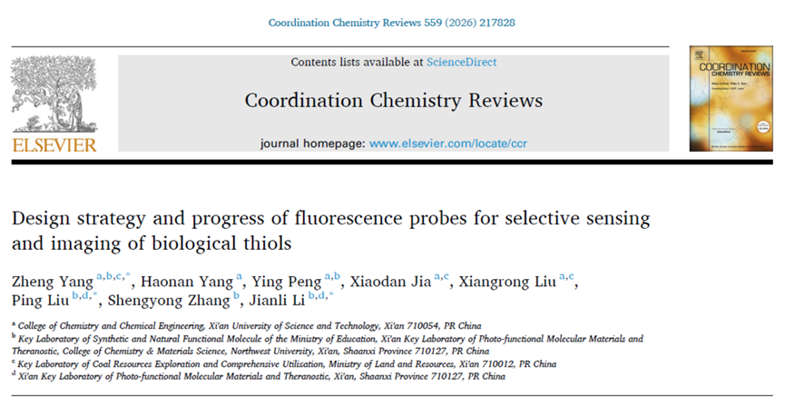 近期,w88win体育官网入口刘向荣教授所带领的功能分子设计与合成研究团队与西北大学化学与材料科学公司李剑利教授团队合作,在国际化学领域顶级期刊《Coordination Chemistry Reviews》(JCR一区TOP期刊,影响因子:23.5),发表了题为《Design strategy and progress of fluorescence probes for selective sensing and imaging of biological thiols》的最新研究成果,这是《Coordination Chemistry Reviews》首次报道公司研究成果。w88win体育官网入口为本研究成果的第一完成单位和通讯单位,w88win体育官网入口功能分子设计与合成研究团队教师杨征为此研究工作的第一完成人,w88win体育官网入口2020级化学工程与工艺专业本科生杨浩楠和2022级应用化学专业本科生彭盈分别为第二和第三作者,刘向荣教授和加晓丹副教授为共同作者。该研究工作得到了国家自然科学基金(22179107、22171223、22307102、U1903133)、陕西省自然科学基础研究计划(2024JC-YBMS-104)、w88win体育官网入口优秀青年科学基金(2018YQ3-14)等研究项目的联合资助支持。