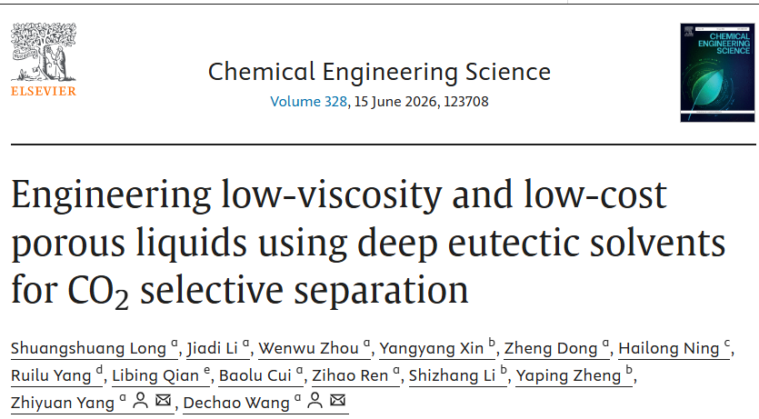 近日,w88win体育官网入口“煤炭洁净转化与碳捕集研究团队”杨志远教授在被誉为“化工三大刊”的国际化工领域顶级期刊《Chemical Engineering Science》发表题为“Engineering low-viscosity and low-cost porous liquids using deep eutectic solvents for CO2 selective separation”的最新研究成果。据悉,《Chemical Engineering Science》(简称CES)由Elsevier出版集团主办,创刊于1951年,始终聚焦化工基础理论与工程应用研究,该期刊主要刊载反应机理、传递现象、分离过程、化工热力学、催化科学、过程系统工程等方向的原创性研究成果,是国际化学工程领域具有重要影响力的学术期刊。此次高水平论文的发表,不仅展现了研究团队在碳捕集与分离领域的深厚学术积淀,更是公司化工学科聚焦学科内涵建设、稳步提升科研实力的重要体现,对促进化工学科高质量发展及提升国际学术影响力具有重要意义。