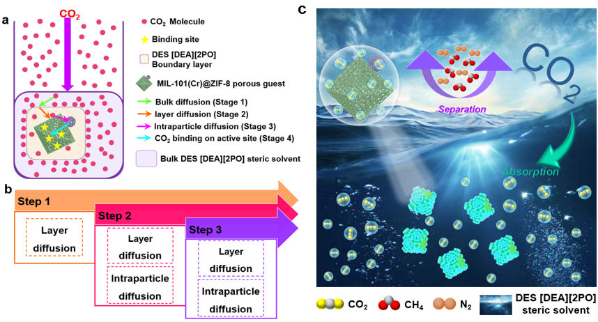 为响应国家“双碳”战略与能源革命要求,针对传统化学吸收剂能耗高、工艺优化空间有限的瓶颈,III型多孔液体因兼具液体良好流动性与多孔固体吸附特性,被认为是实现低能耗、高效气体分离的潜在新体系。围绕这一前沿方向,团队创新性地以绿色低共熔溶剂(DESs)为位阻溶剂,以MIL-101(Cr)@ZIF-8介-微孔核壳MOFs为多孔客体,成功制备了新型多孔液体,并实现了优异的CO2/N2和CO2/CH4分离性能,为天然气纯化与沼气提质提供了潜在解决方案。本研究核心创新在于从传质机理层面深化了对多孔液体中气体吸着分离行为的理解,通过理论拟合与模型构建,深入剖析了气体在多孔液体中的气体选择性吸着分离行为。在热力学方面,最优SS-Langmui -Freundlich模型拟合结果表明,吸着-分离过程并非单一机制主导,而是均相与非均相吸着竞争行为共存。在动力学方面,通过颗粒内扩散(IPD)模型与Boyd模型等,共同阐明了表面层扩散与颗粒内扩散协同构成限速步骤的多阶段传质过程。该成果从机理层面深化了对III型多孔液体吸着行为的认识,为设计兼具高吸着量、高选择性和低再生能耗的新型绿色分离介质提供了理论依据和经济高效的新路径。