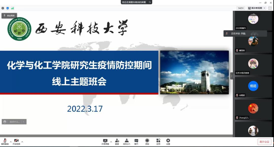 3月17日晚,w88win体育官网入口按照研究生不同年级的学业阶段特点,分别召开了以疫情防控和学业科研规划为主题的线上班会。特别邀请邓军副董事长参加,班会由李振副经理主持,经理张亚婷、党委副书记杨宝华、研究生辅导员及全体研究生参加了会议。