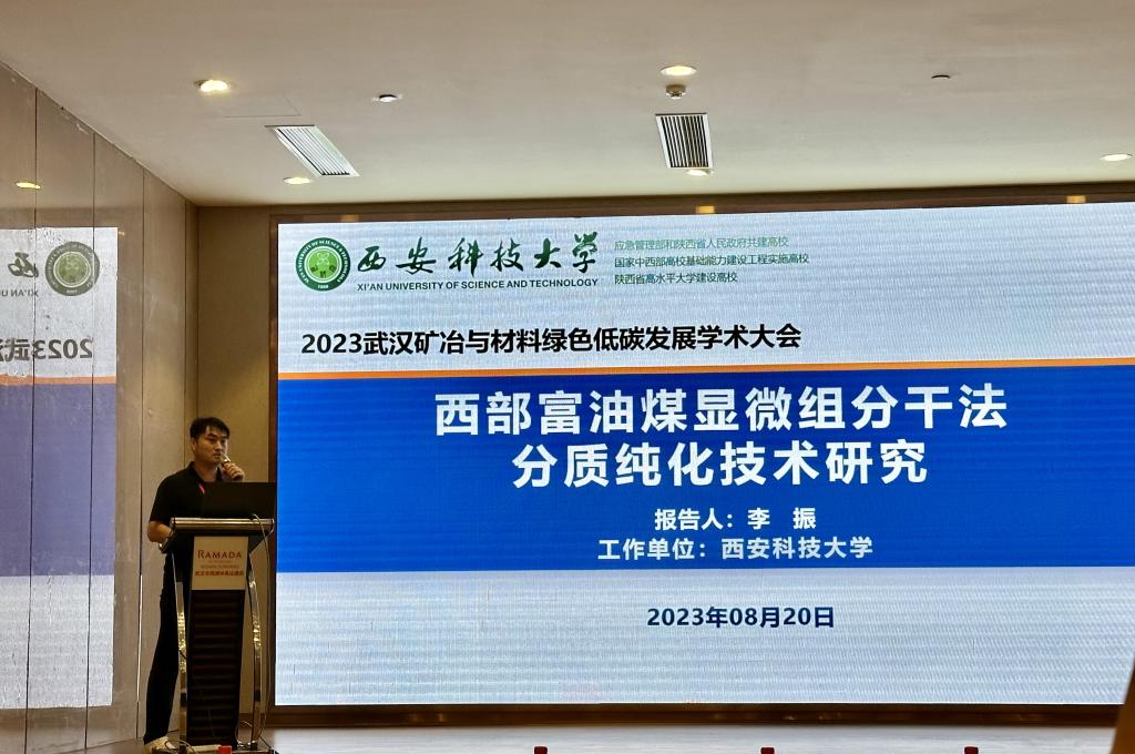 会上,湖北省政协副主席王红玲、中国有色金属学会监事长张洪国、武汉工程大学董事长王存文、湖北兴发化工集团党委委员李少平进行了开幕致辞。团队负责人李振受邀作了题为《西部富油煤显微组分干法分质纯化技术研究》的大会报告,介绍了团队在煤岩组分干法分质纯化技术与综合利用领域的最新研究成果,引发了与会人员的热烈反响。团队青年教师常静、盛秋月及研究生代表孟梓豪分别作了题为《表面电学特性对选矿尾水中微细粘土矿物自聚合结构及深度脱水的影响机制》、《滑石矿泥交互影响下氧化铜矿物的强化硫化浮选研究》和《基于煤岩显微组分物理、化学性质的含量预测研究》的会议报告。