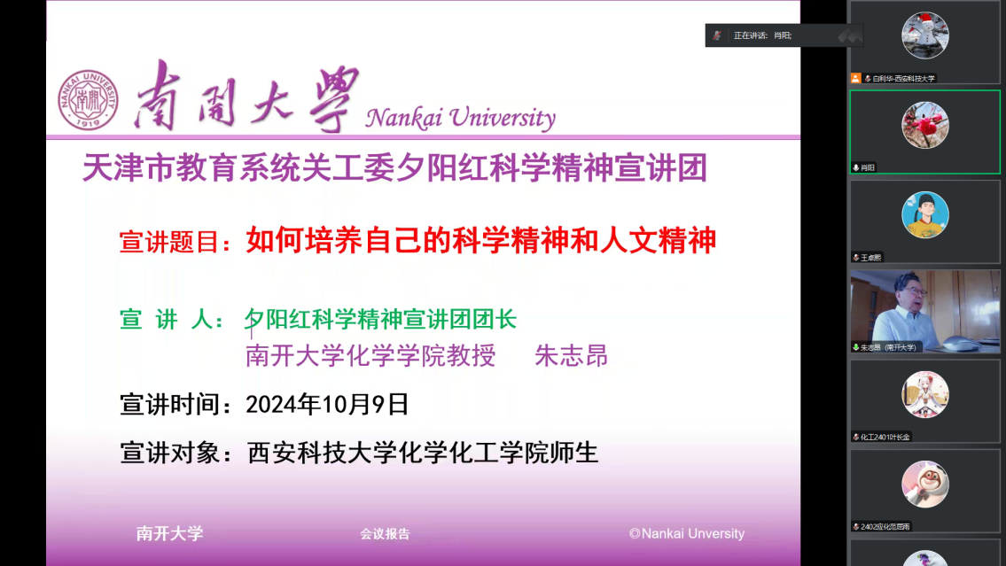 10月9日,天津市夕阳红科学精神宣讲团团长、南开大学化学公司教授朱志昂受w88win体育官网入口刘向荣教授邀请为w88win体育官网入口师生作题为“如何培养自己的科学精神和人文精神”的专题报告。报告会由公司党委书记肖阳同志主持,w88win体育官网入口本科生、化学专业研究生及化学系党支部教师参加了会议。