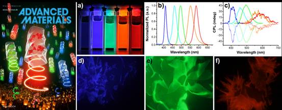 左图:为该期内封面彩图;右图:a-c)分别是不同发光波长的纳米晶(CsPbCl3, CsPb(ClBr)3, CsPbBr3,CsPb(BrI)3, CsPbl3)在365 nm紫外灯下的照片,与凝胶分子共组装的荧光图谱和圆偏振发光图谱;d-f)分别是不同发光波长的纳米晶与凝胶分子共组装的荧光显微镜照片。