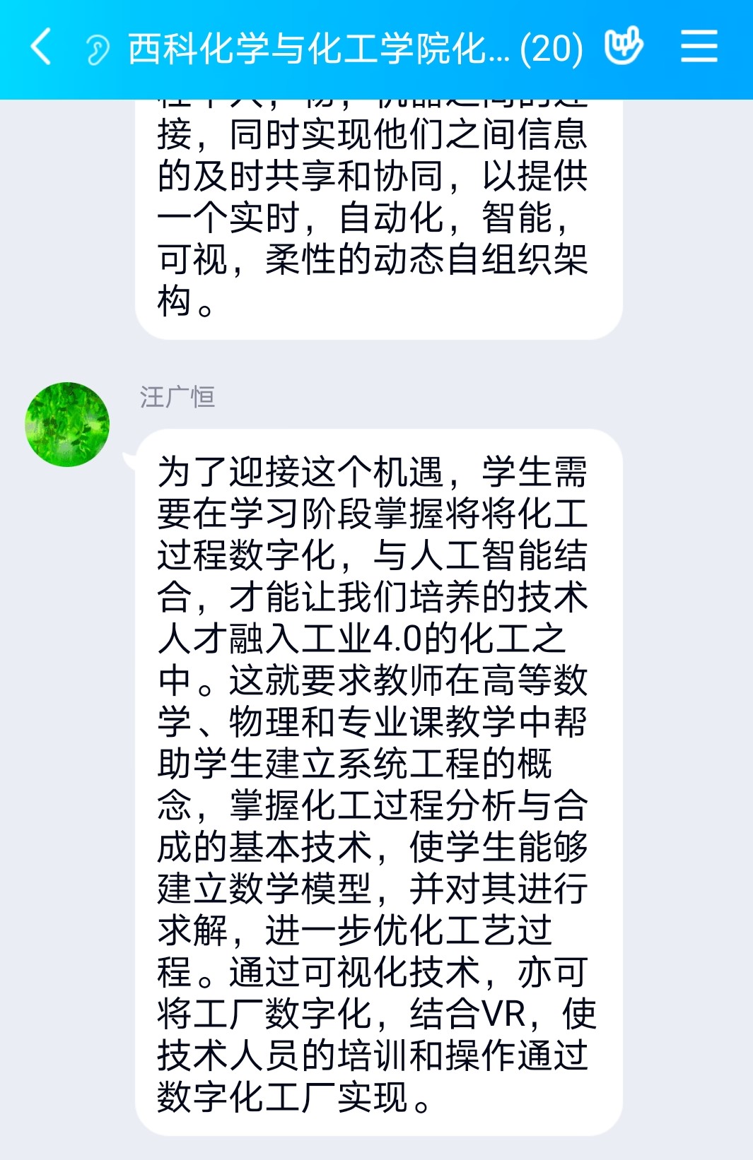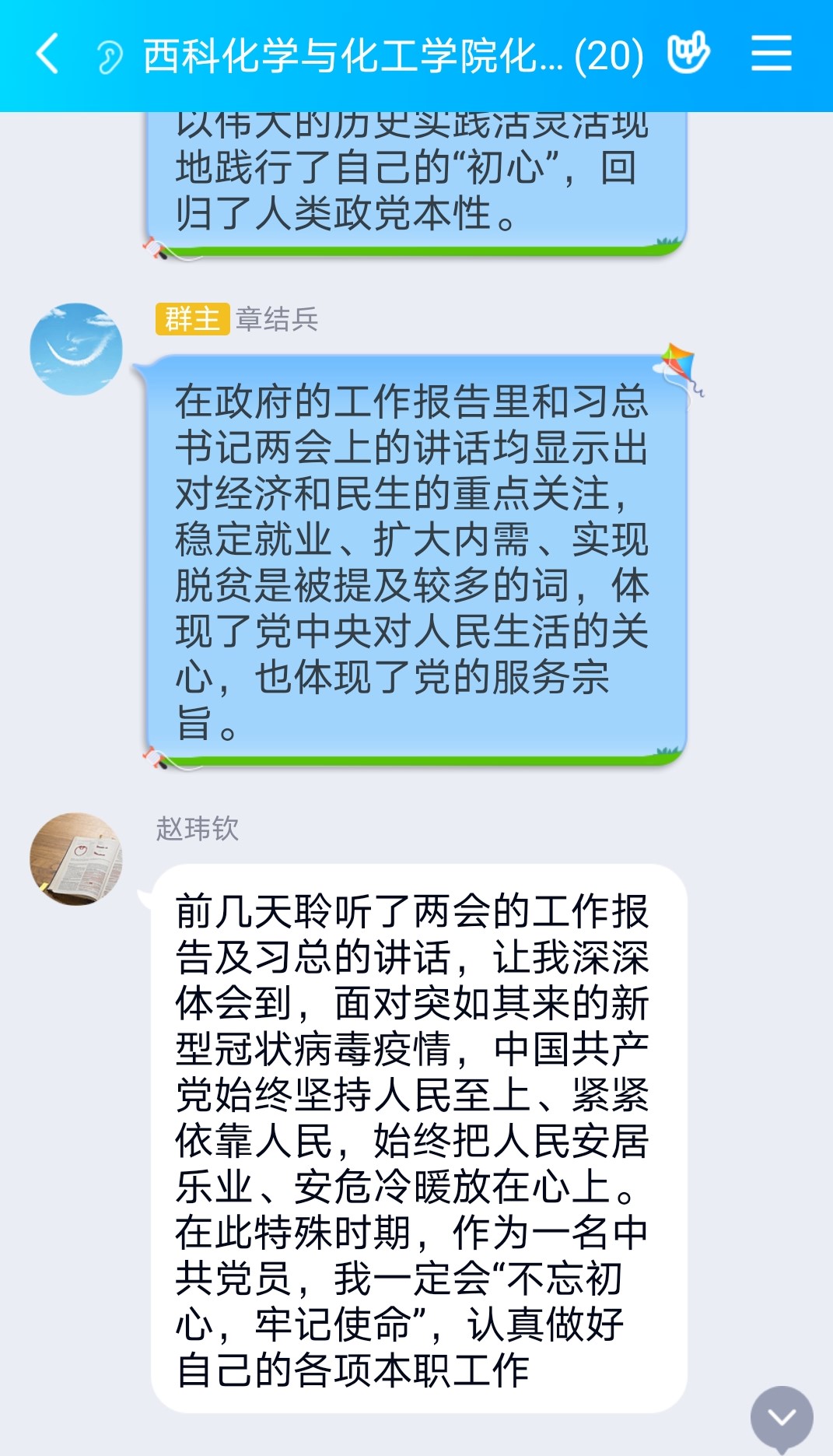 为了及时学习“两会报告”和习近平总书记讲话精神,化工系党支部举行了“学习两会精神,立足高等教育前沿”主题党日活动。69日,在线召开了支部党员组织生活会,进行学习交流,期间讨论积极,气氛热烈,并最终进行了活动总结。疫情期间,支部一直坚持组织党员老师在线学习,使线上学习常态化,增强了支部党员之间的凝聚力。