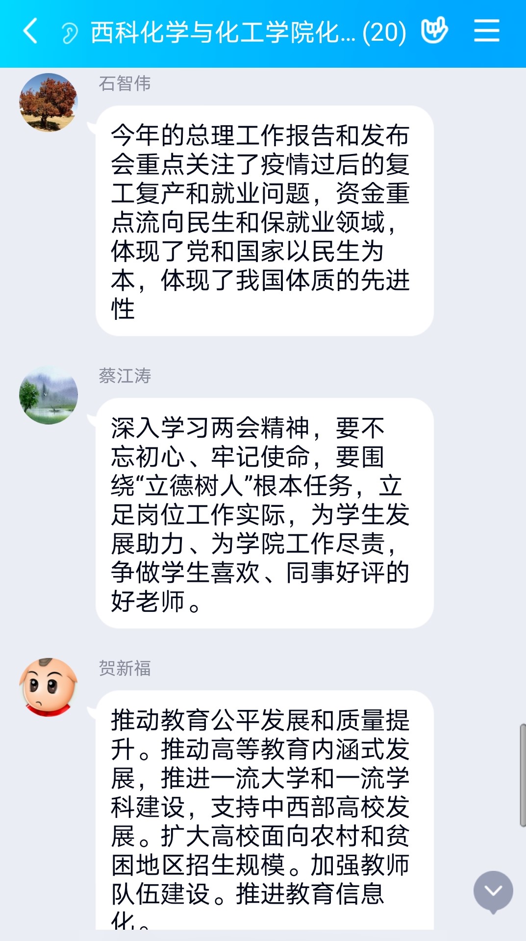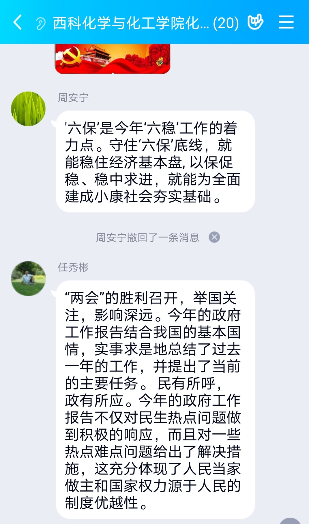 “两会报告和习近平总书记讲话精神”学习交流中,大家畅所欲言。面对突如其来的新冠肺炎疫情,中共中央高度重视。习近平总书记亲自指挥部署,坚持以人为本,坚守生命,领导全党全军全国各族人民打好疫情防控的人民战争、总体战、阻击战,取得重大战略成果,统筹推进疫情防控和经济社会发展工作取得积极成效,充分彰显了中国共产党领导和中国特色社会主义制度的显著优势,彰显了中国力量、中国精神、中国效率。我们要坚持中国共产党领导,深入贯彻中共十九届四中全会和中央政协工作会议部署,增强“四个意识”、坚定“四个自信”、做到“两个维护”,更加紧密地团结在以习近平同志为核心的中共中央周围,扎实工作,拼搏进取,为实现“两个一百年”奋斗目标、实现中华民族伟大复兴的中国梦而努力奋斗!